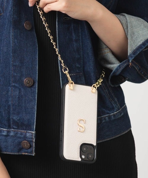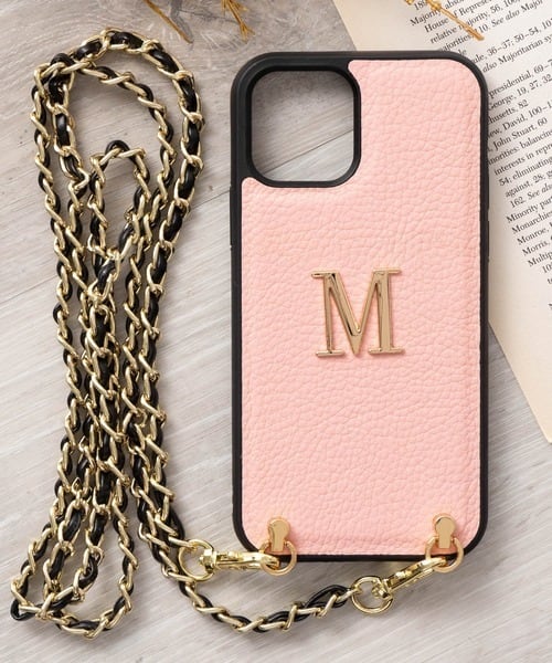 ゴールドチェーンのストラップとゴールドのイニシャルデザインがさらに高見え要素に。